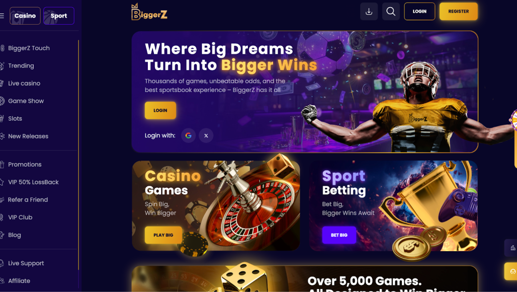 - Game Selection: 5,800+ games including exclusive BiggerZ Originals